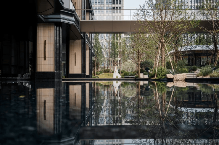 社区内部打造了黑松、常绿乔木的园林、多场景接待大厅、水系景观、开放式架空停车层、艺术空间等。