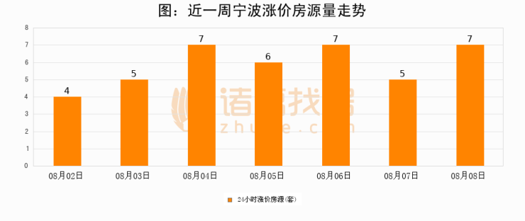 根据诸葛找房数据显示,宁波24小时涨价房源量为7套,较08月07日增加2套,环比上涨40%。与此同时,涨价房源占比小幅扩大,业主信心有所提升。