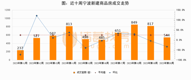 进入2023年第50周(12月04日-12月10日),宁波新建商品房成交544套,较上周减少273套,环比下降33.4%