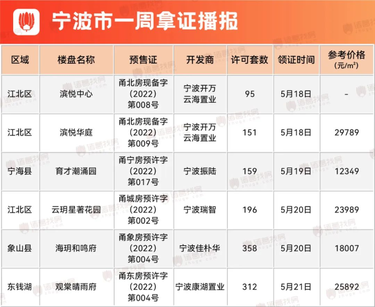 本周宁波大市共6个楼盘取得许可证,入市房源共计1075套,其中市六区共计754套 。