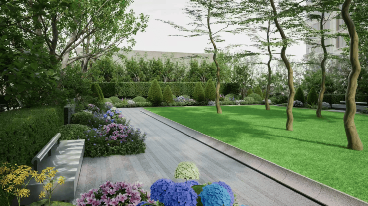 南向约52.6米阔绰栋距,楼下即是约800㎡“吉维尼花园”,设计灵感源自莫奈花园,归家如穿行印象派画卷,采光与景观俱佳。