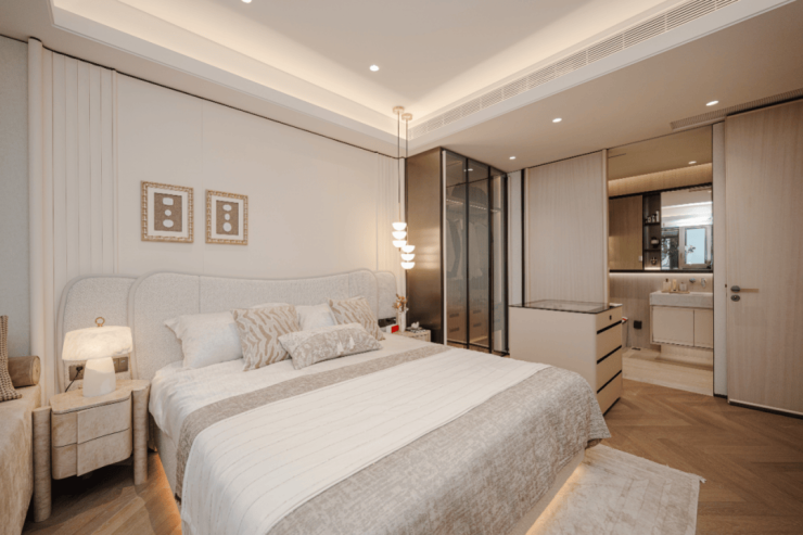 卧室的套房化演绎:主卧不仅是休憩之所,边套户型更拥有约270°非承重飘窗与一步观景阳台,将风景变为私藏。大金空调地暖两联供与霍尼韦尔新风,构建出恒温、恒净、恒氧的静谧之境。