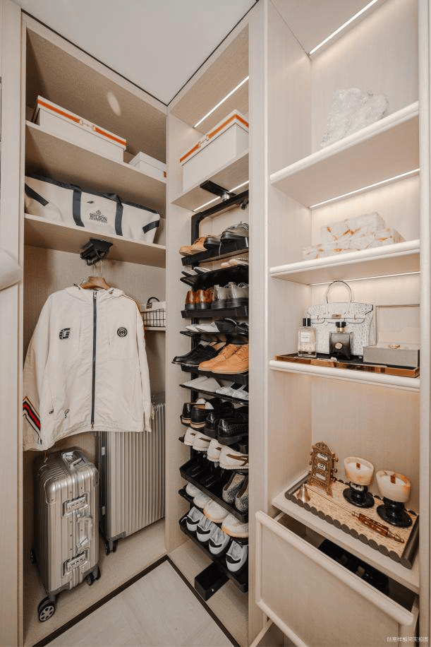 “八百库”玄关系统:在玄关处,一个隐藏式收纳空间被巧妙嵌入。它专为家庭中那些“无处安放”的大件杂物、行李箱、次净衣而生。配合“藏八露二”的玄关柜系统,从此,开门不再是面对杂乱,而是一种从容的仪式感。