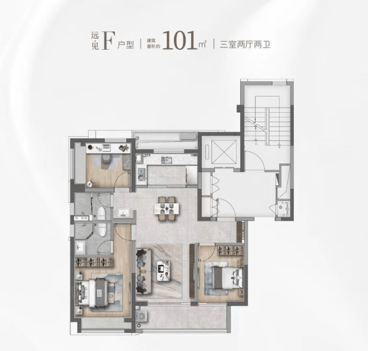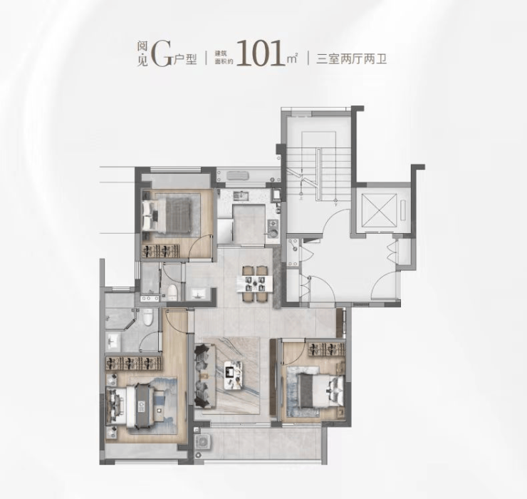 建面约101㎡的F和G户型都是市面上备受认可的飞机经典款户型。