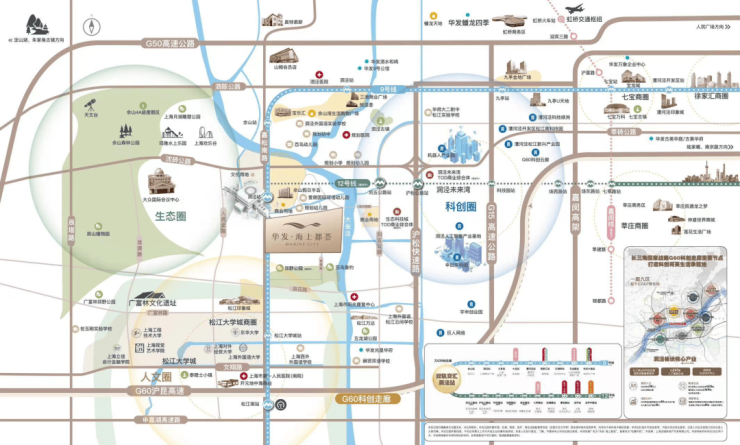 合心规划 产城样板:【“科创+人文+生态”城市单元示范】华发海上都荟首入松江,携崭新“优+产品体系5.0”,为洞泾、乃至为松江带来目前区域内综合高品质作品。结合上海生态环境保护“十四五“规划,站位国际领先的可持续性项目规划,华发海上都荟结合自身的独特聚合优势,在传统TOD规划之上,不可复制的土地生态资源,向东链接G60科创走廊“以镇命名为区块”洞泾人工智能产业基地;向南直达亚洲大学城之一——松江大学城;北侧紧连上海陆面自然山林资源——佘山国家旅游度假区。板块将区域打造成为“科创+文教+生态”交汇的核心新城模式,划立一个崭新的城市单元示范。