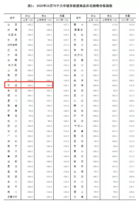 宁波作为长三角区域的城市之一,不论是房价涨幅还是政府严格调控算得上是榜上有名。就在昨天,国家统计局发布2020年10月份全国70个大中城市商品住宅销售价格变动情况,在70个大中城市房地产市场价格涨幅保持平稳回落态势。其中,宁波新房环比上涨0.1%,同比上涨4.9%。