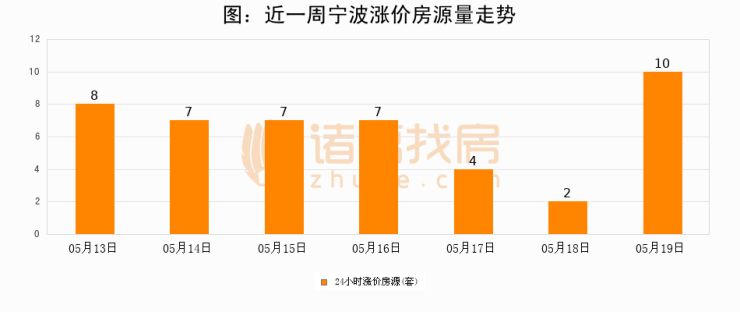 根据诸葛找房数据显示,宁波24小时涨价房源量为10套,较05月18日增加8套,环比上涨400%。与此同时,涨价房源占比小幅扩大,业主信心有所提升。