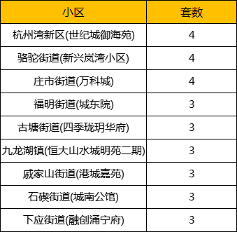 其中杭州湾新区(世纪城御海苑)、骆驼街道(新兴岚湾小区)、庄市街道(万科城)成交4套,并列榜首。