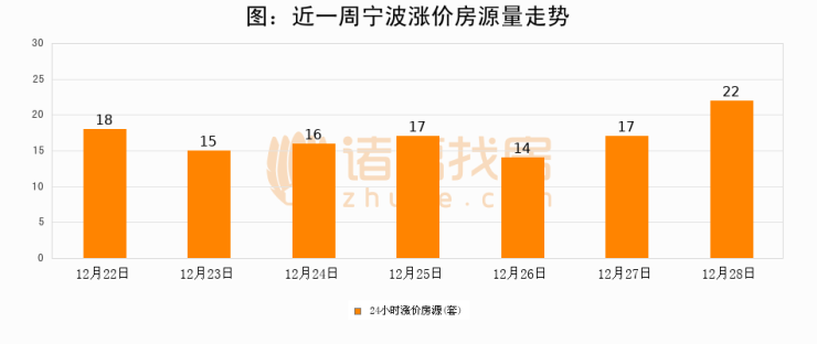 根据诸葛找房数据显示,宁波24小时涨价房源量为22套,较12月27日增加5套,环比上涨29.4%。与此同时,涨价房源占比小幅扩大,业主信心有所提升。