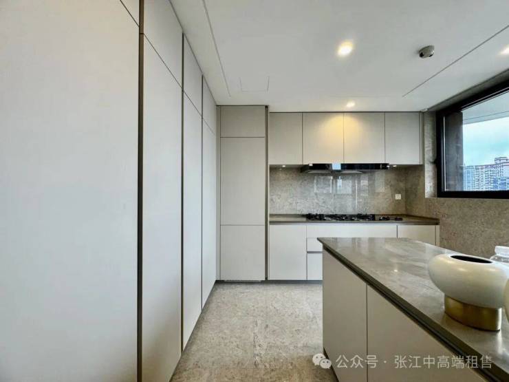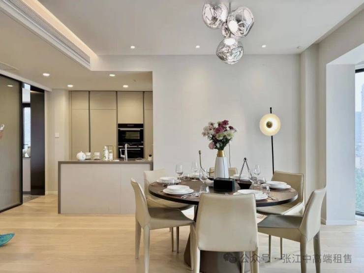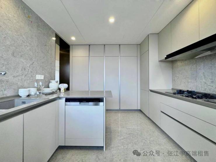 厨房则配备了西门子燃气灶、烤箱、油烟机、嵌入式冰箱,汉斯格雅的厨房龙头,AROSA MOBILIA的橱柜等