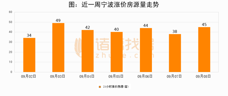 根据诸葛找房数据显示,宁波24小时涨价房源量为45套,较09月07日增加7套,环比上涨18.4%。与此同时,涨价房源占比小幅扩大,业主信心有所提升。
