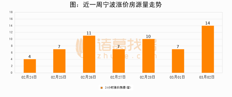 根据诸葛找房数据显示,宁波24小时涨价房源量为14套,较03月01日增加7套,环比上涨100%。与此同时,涨价房源占比小幅扩大,业主信心有所提升。