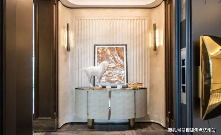例如入户玄关铺设有“石材皇后”鱼肚印象,这种级别的奢石在很多项目中通常仅作局部镶嵌。