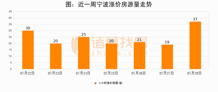根据诸葛找房数据显示,宁波24小时涨价房源量为37套,较07月27日增加18套,环比上涨94.7%。与此同时,涨价房源占比小幅扩大,业主信心有所提升。
