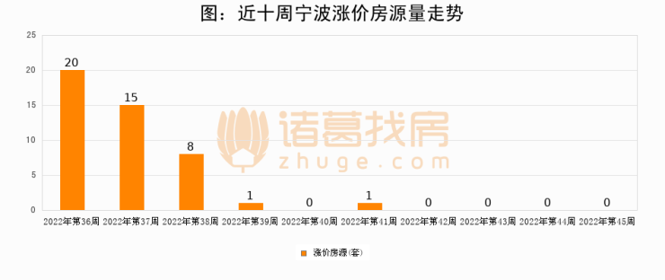 从调价房源来看,第45周宁波涨价房源0套,较上周持平。与此同时,45周涨价房源占比持平
