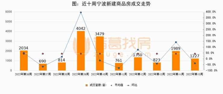 进入2022年第45周(10月31日-11月06日),宁波新建商品房成交1227套,较上周减少762套,环比下降38.3%