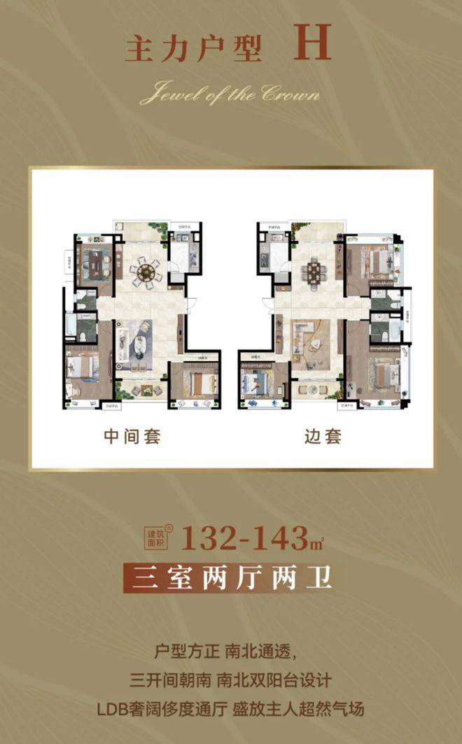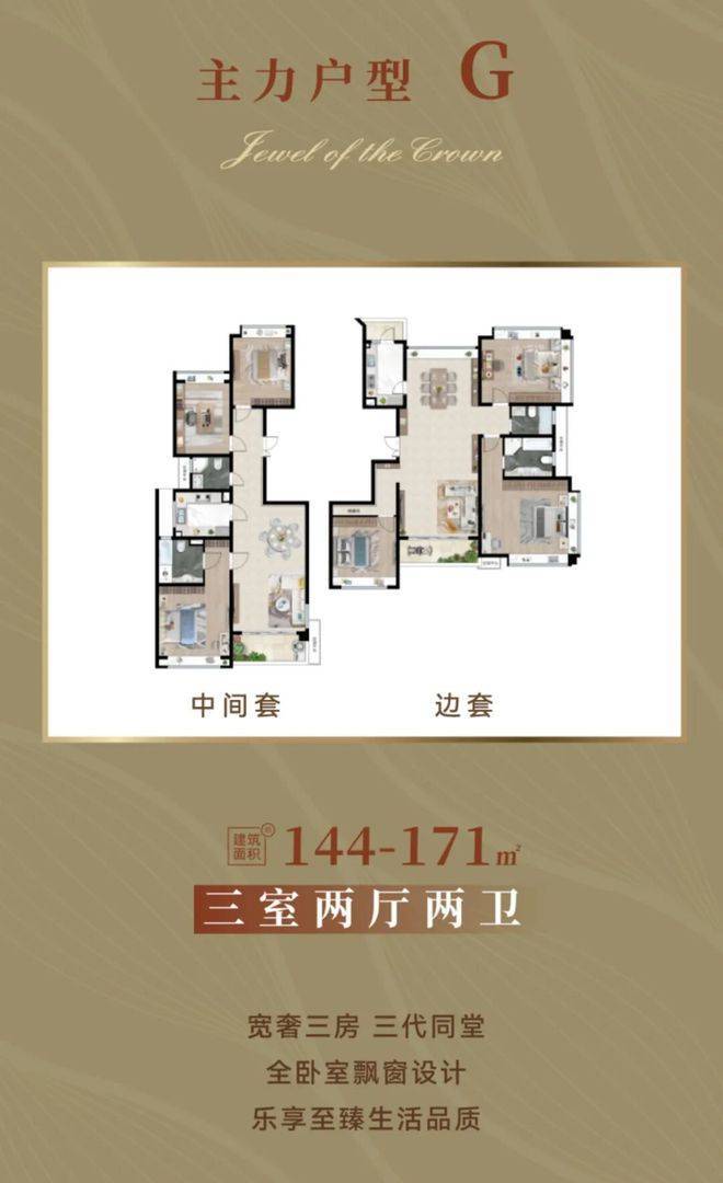 172㎡3房2厅3卫:横厅设计,7米宽幕阳台,270° 转角飘窗,双主卧套房 + 独立家政间,终极改善天花板,仅18套。