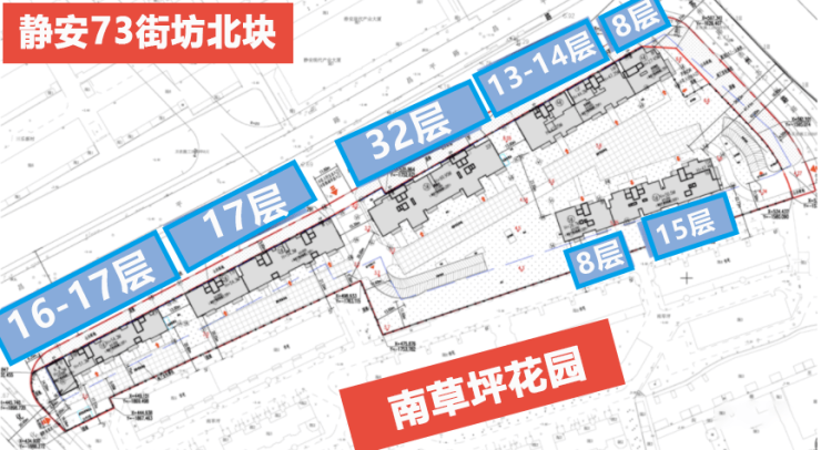 73街坊共分为南北两块,是老静安为数不多的纯住宅地块,北地块的高层住宅部分共将新建5栋8层至32层的住宅楼,总住宅开发体量共约7.25万㎡,总套数仅有468套。
