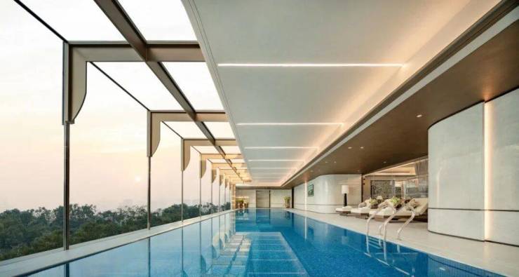 悬浮于十米之上的空中浮岛会所也实景呈现,涵盖空中悬浮泳池、运动健身场地、商务会客私宴厅、社交酒廊等功能。
