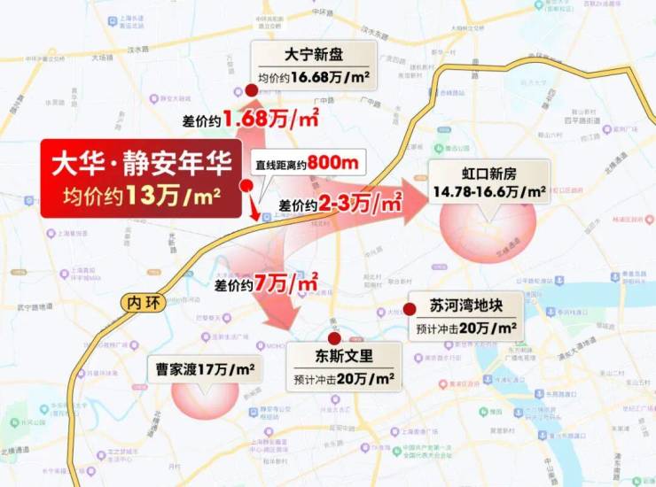 放眼整个静安区,曹家渡17万/㎡,东斯文里和苏河湾项目预计冲击20万/㎡,和大华·静安年华高层差价预计近7万/㎡。旁边虹口新房售价也已达14.78-16.6万/㎡。