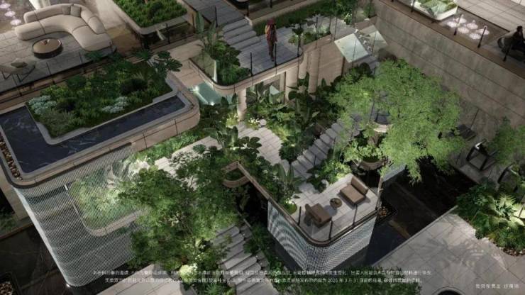 社区景观方面,项目运用室内手法室外化设计构想,将垂直景墙、悬浮观景台与叠水景观立体穿插,形成情随境转的沉浸式体验,自然元素渗透进室内,并与室内空间动态互动。