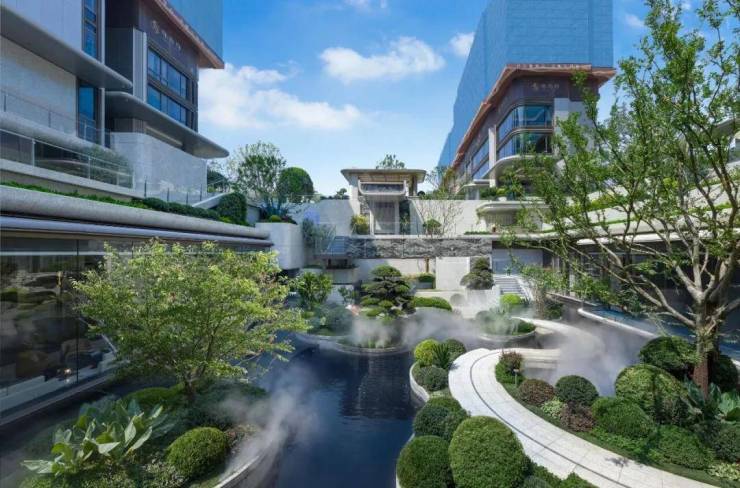 整个庭院设计层次感丰富,立体景观叠层交错,形成场地高低差,加上叠水飞瀑,随手一拍都是满满的松弛感。