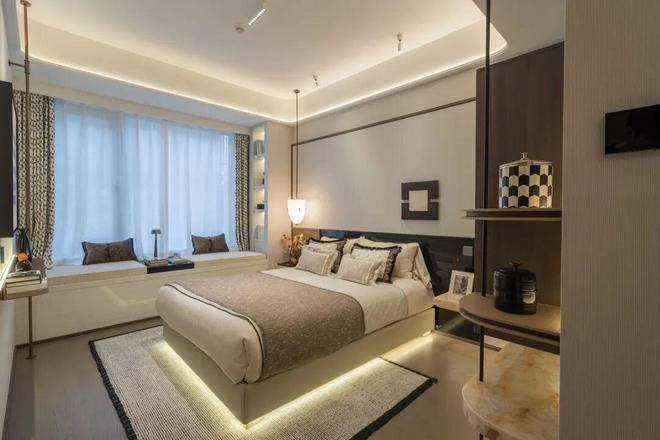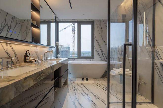 比如采用了摩根声光电全屋智能、厨房博世洗碗机和冰箱2件套、老板旗舰款的油烟机燃气灶以及蒸烤一体箱;卫浴是科勒、高仪、唯宝等大牌,配有美妆冰箱和智能马桶等,符合精英的生活需求。