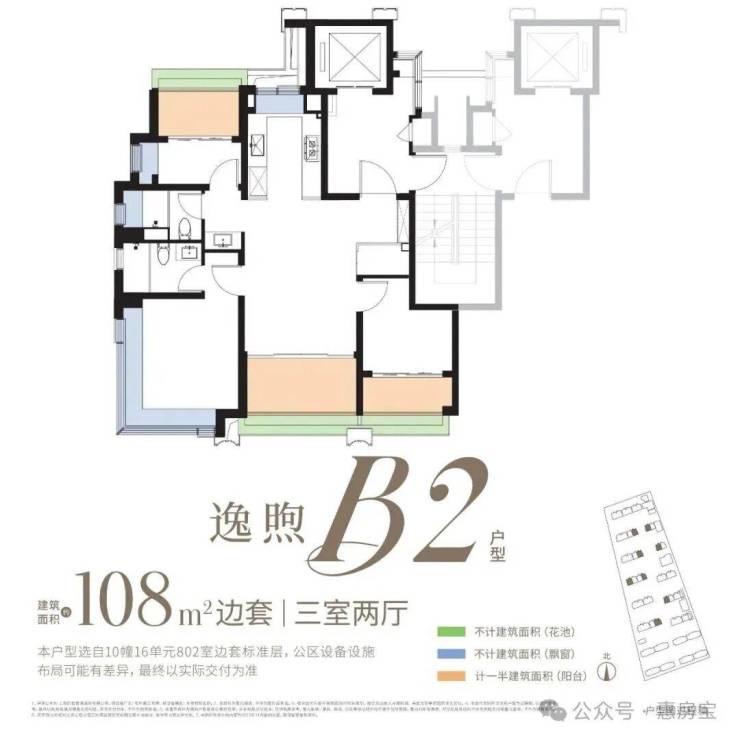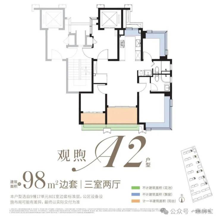 约98㎡3房:类一梯一户、全屋飘窗为标配,双阳台+花池是核心亮点(市面双阳台户型起步多为约110㎡),整体附赠约23㎡,是罕见的高实得率精致户型。