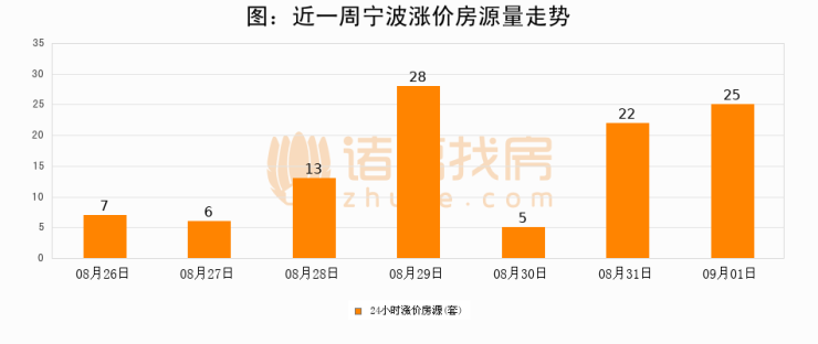 根据诸葛找房数据显示,宁波24小时涨价房源量为25套,较08月31日增加3套,环比上涨13.6%。与此同时,涨价房源占比小幅扩大,业主信心有所提升。