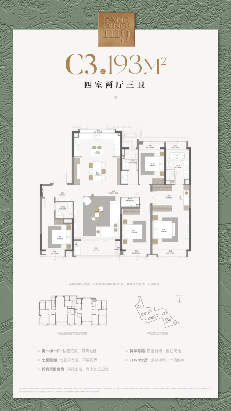 以建面约193户型为例,卫浴设备采用国际品牌如唯宝、高仪、卡德维等,厨电品牌采用嘉格纳,全套配置油烟机、灶台、洗碗机、双开门冰箱、蒸烤一体机等,同时装配德国美诺洗衣机烘干机套装。