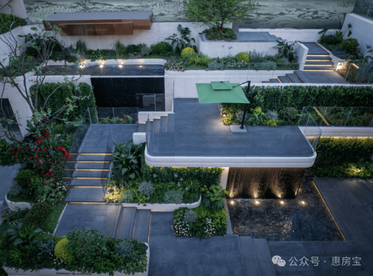 蓝翡翠水景围着下沉庭院,中间有蜿蜒的挑台连着瀑布,顶层还有供业主小聚的女王花厅,