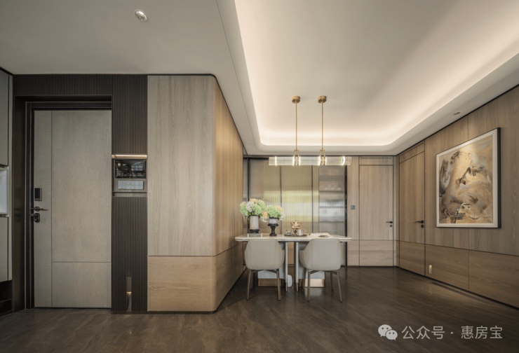 与常规新房室内没有门与墙的生硬拼凑感不同,江湾金茂府通过大量木饰面、隐藏门等细节,形成统一的设计语言,色彩与材质搭配协调统一,尽显整体美感!