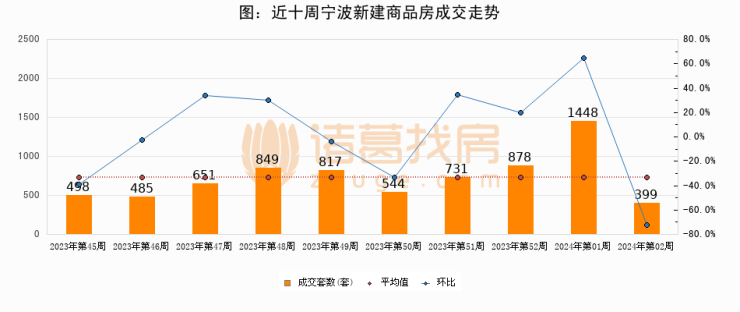 进入2024年第01周(01月01日-01月07日),宁波新建商品房成交399套,较上周减少1049套,环比下降72.4%