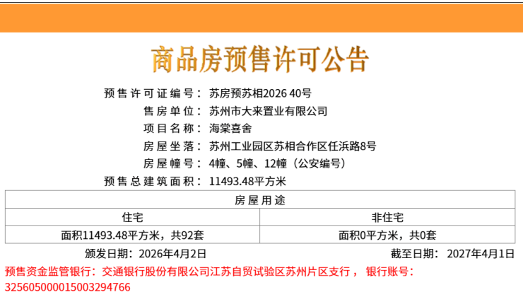 时隔近7个月之后,相城区的又一个新盘海棠喜舍取证了!