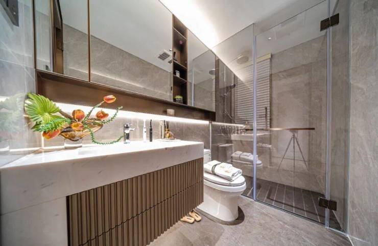 卫生间镜柜也延伸至马桶上方 ,精心设计了 壁龛收纳 ,整体设计感更强、几乎将收纳做到了极致!