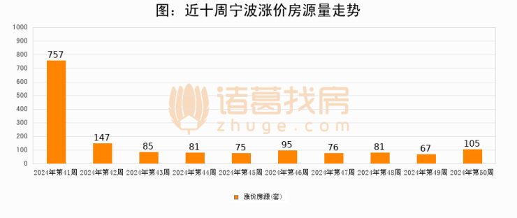 从调价房源来看,第50周宁波涨价房源105套,较上周上涨56.7%。与此同时,50周涨价房源占比提升4.56个百分点,业主信心持续恢复。