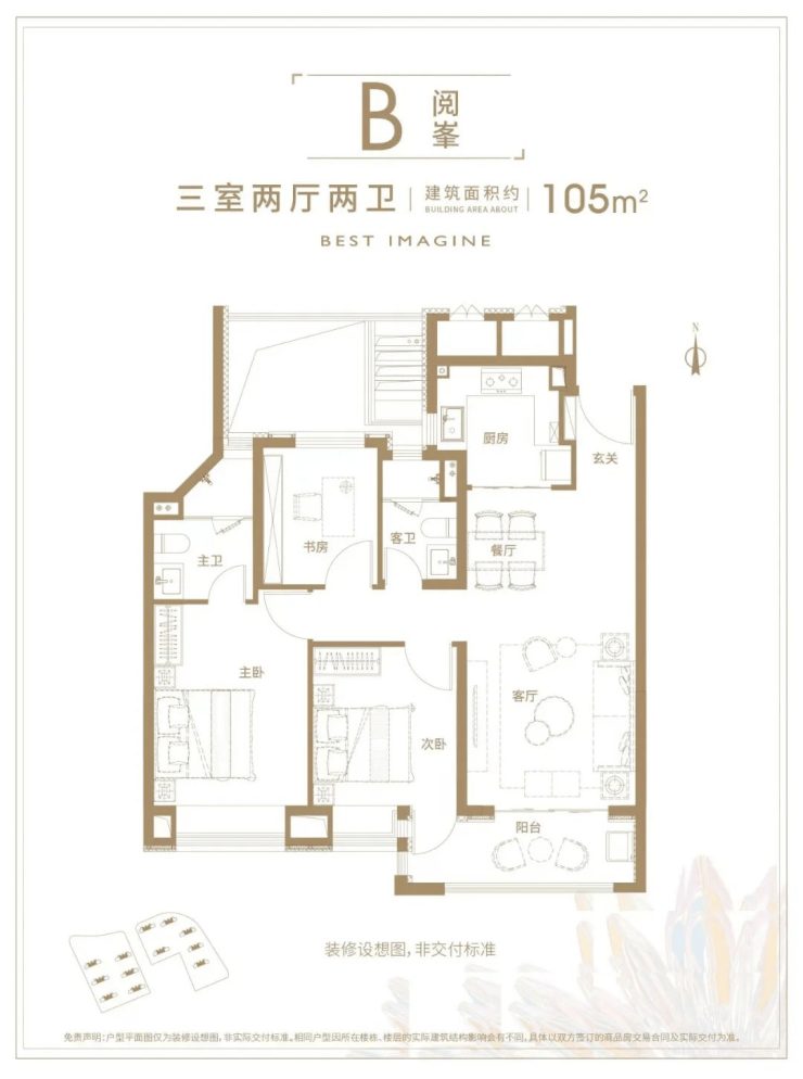建面约105㎡三房两厅两卫户型,整个设计户型方正,动静分离,三开间朝南,全明格局,带超大景观阳台;主卧套房设计,尺度感和私密性兼具;而且还是双卫设计,全屋带飘窗,延展了使用空间,兼具舒适性和空间感,堪称初改首选。