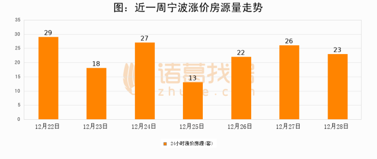根据诸葛找房数据显示,宁波24小时涨价房源量为23套,较12月27日减少3套,环比下降11.5%。与此同时,涨价房源占比小幅回落,对于购房者来说是一个入市窗口期,购房者可抓住时机入市。