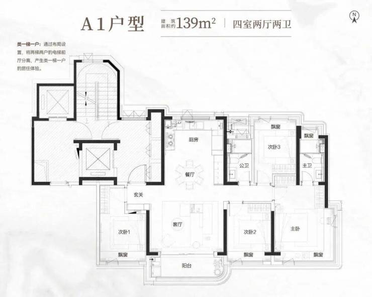 139㎡四房两厅两卫:四开间朝南,南向面宽约15.05米,LDKB一体化布局,独立电梯厅入户,主卧套房升级,配备270°转角飘窗、步入式衣帽间及双台盆卫浴,媲美160㎡以上豪宅体验