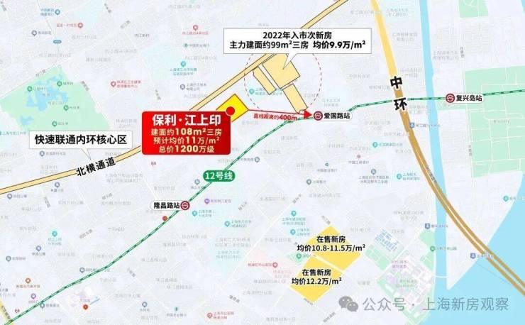公共交通:距轨道交通12号线爱国路站约400米,周边有 22 路、33路、60路、812路等公交线路,距中环1公里。项目坐拥三横四纵一桥六隧道立体交通,紧贴北横通道周家嘴路入口,1个红绿灯即入,这条上海第二条东西向交通主动脉,一路直达北外滩、静安寺等核心区。