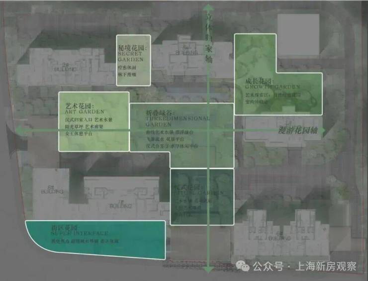 立体折叠绿洲园林:南北双轴布局,五大主题花园+约900㎡儿童活动空间