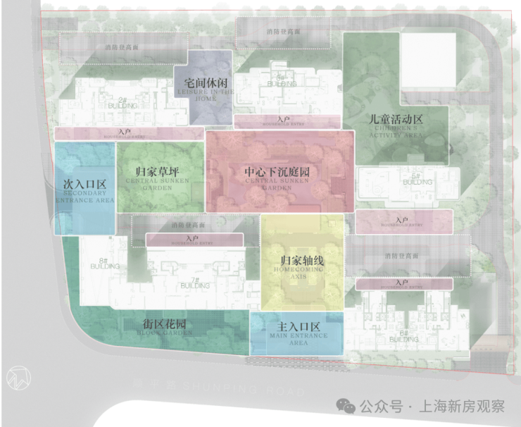 全部楼栋底层局部架空,打造多个景观架构,最大楼间距达到43米,并在小区中央位置配置下沉庭院;6# 楼一至二层设置物业、业委会及智能快递柜等;7# 楼一层设有社区卫生服务点;社区内部有下沉式庭院、景观架构等。