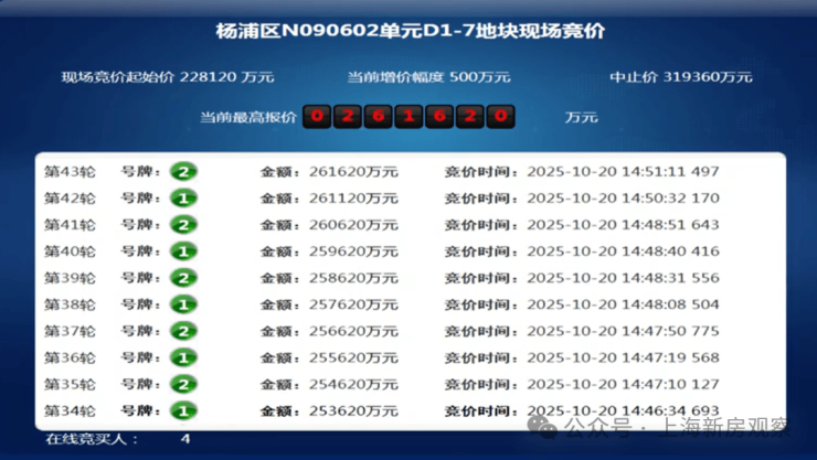 10月20日,上海八批次土拍中,保利置业以总价261620万元竞得杨浦定海N090602单元D1-7地块,该地块溢价率14.69%,楼板价69958元/㎡。