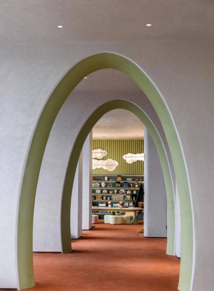 第二个,“向阳而生”。运用大面积的落地玻璃窗,让这个区域变的更加透亮。让绿意充分渗入,实现近距离、无遮挡观景视野。试想一下那个画面,当家长在外奔波一天,回家的路上,看到暖暖的光从玻璃盒子中映射,孩子笑的天真烂漫,回家的脚步也会不自觉的变得轻快了。
