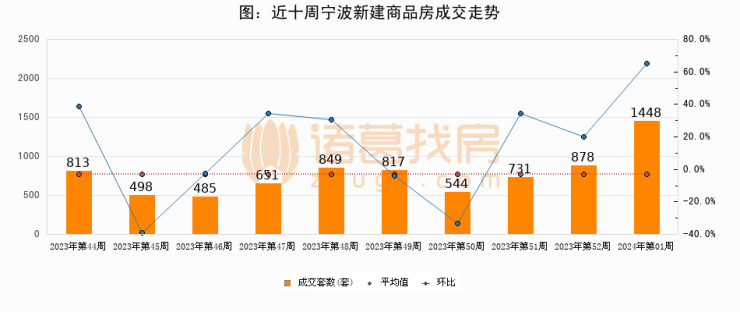 进入2024年第52周(12月25日-12月31日),宁波新建商品房成交1448套,较上周增加570套,环比上涨64.9%