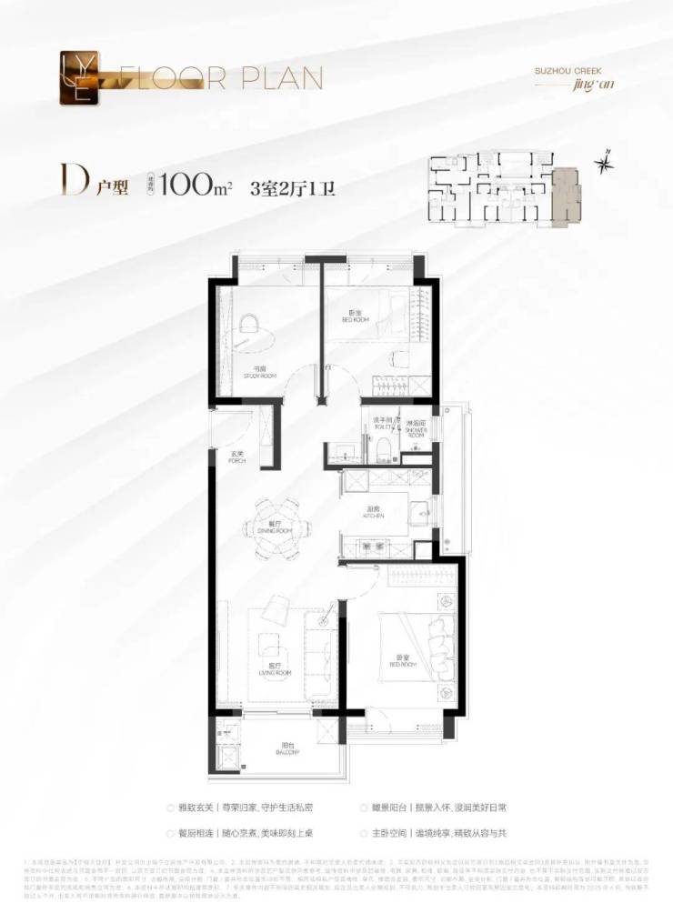 100㎡ 三房两厅一卫(D户型):南北通透、三分离卫生间、高得房率,功能性突出