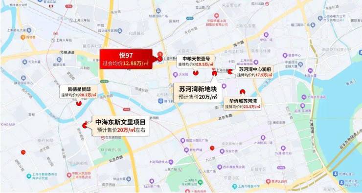 二手房方面,项目周边房龄较新的二手小区,比如凯德星贸邸、中粮天悦壹号、华侨城苏河湾等挂牌均价也在20万/㎡甚至朝上!
