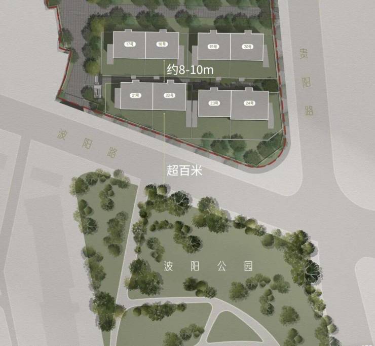 约10米Max楼距,尊享私密空间;头排超百米,后排约8-10米楼距,断层级尺度。