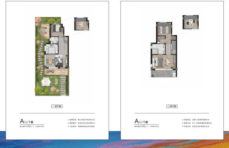 来看户型,面积段有两种——建面约95㎡下叠、上叠;建面约150㎡下叠、上叠。