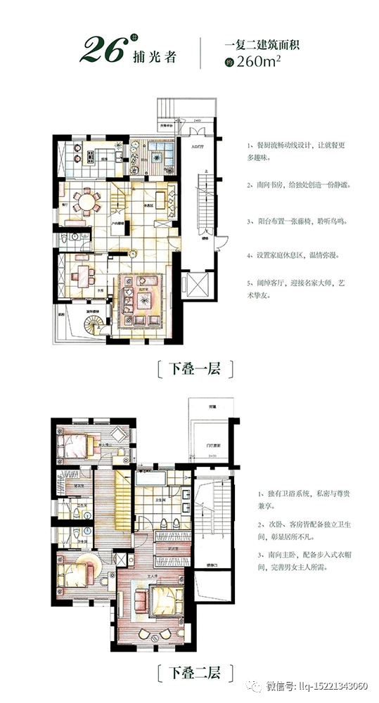 叠加别墅:建面约260-280㎡,分为上叠(3-4层)和下叠(1-2层+地下室),主力为4室设计